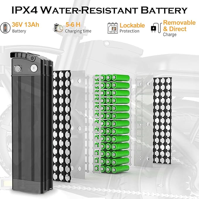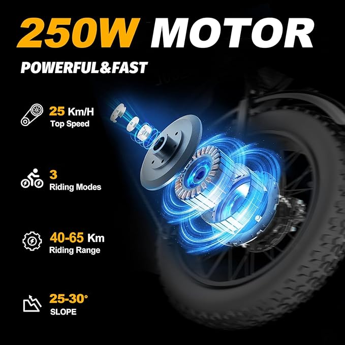 Equipped with a 250W 36V 13Ah high-speed brushless motor and removable battery, it delivers up to 40–45 km range on full electric mode or 60–65 km with pedal assist. The battery fully charges in just 6–8 hours and endures over 2000 charging cycles. Its climbing power handles slopes up to 25°, ensuring smooth uphill rides.