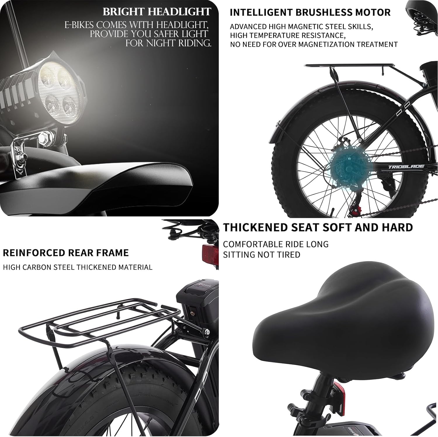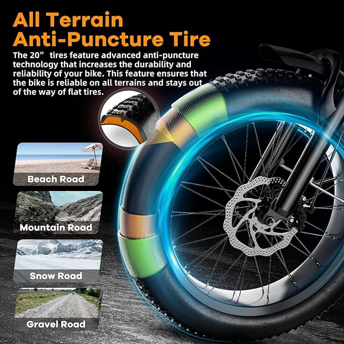 This electric bike offers 3 riding modes—Pure Electric, Pedal Assist (PAS), and Manual—giving you flexibility depending on your energy and terrain. The 20-inch one-piece fat tires provide excellent traction, while the front and middle shock absorbers ensure stability and comfort.